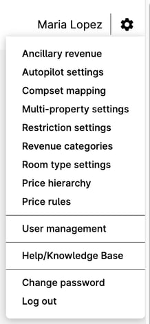 The settings menu is located in the top right corner next to the user name in the system. By clicking the cogwheel icon a dropdown menu with all the settings options will be displayed.